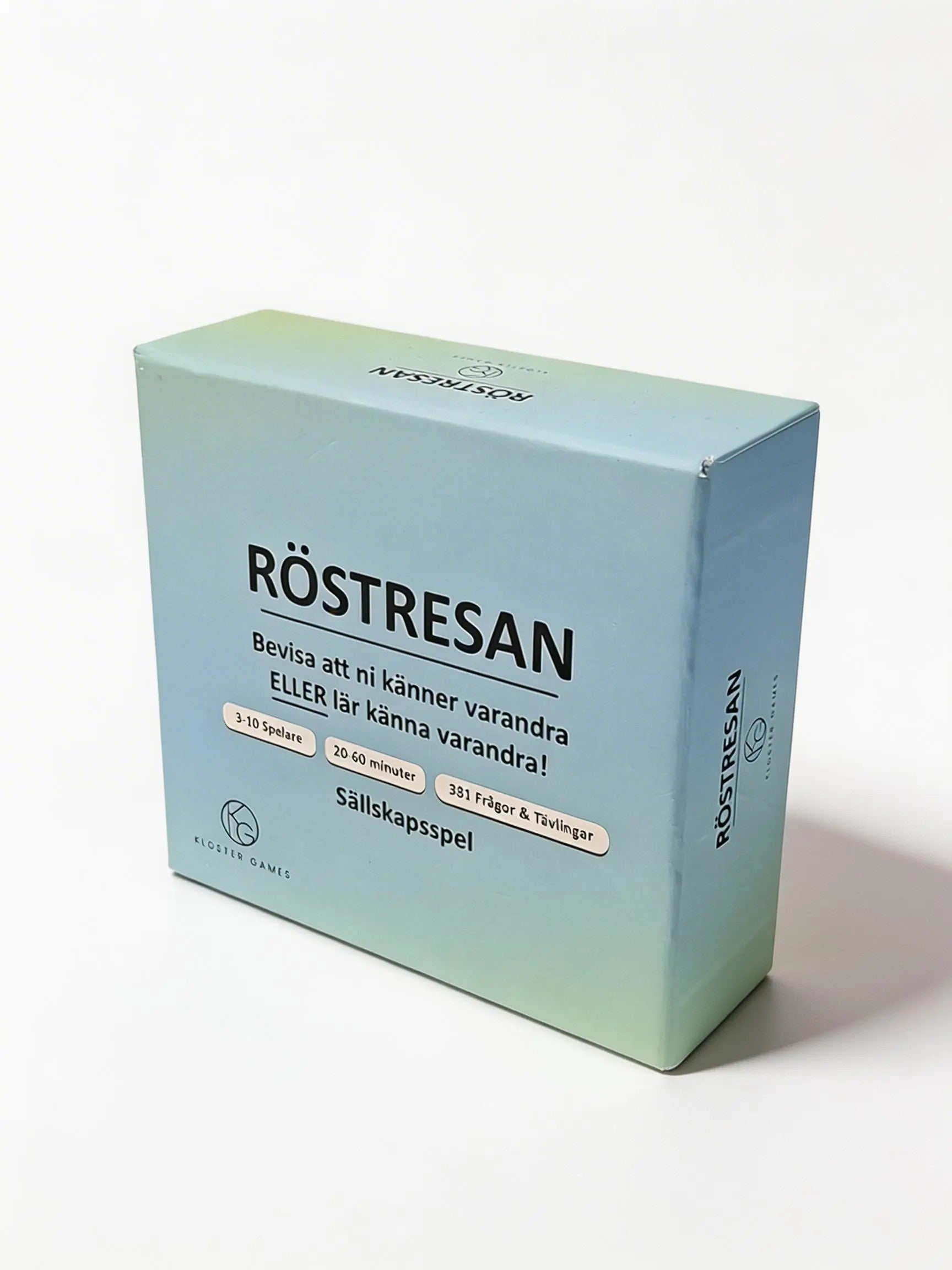 Röstresan är ett engagerande sällskapsspel för 3 till 10 spelare där allas åsikter räknas! Spelet går ut på att svara på frågor genom att rösta med röstkort, och sedan följa hur majoritetens val påverkar varje spelares framfart på spelplanen.